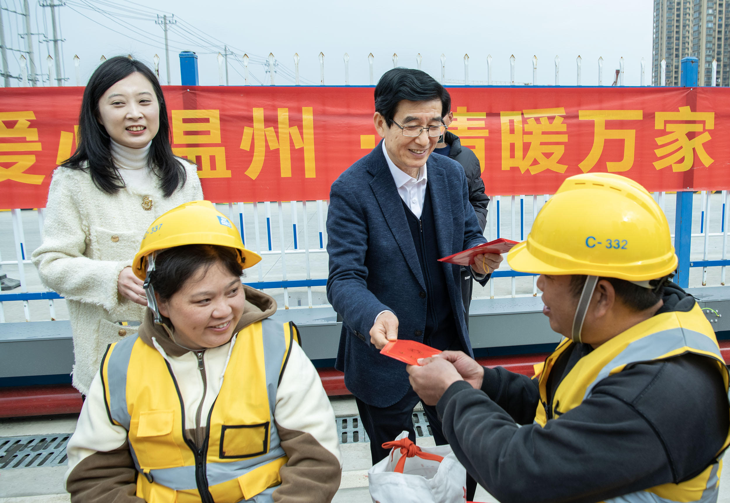在温州市的重点工程温州二中西部新城校区的工地分会场,市慈善总会的领导仇杨均、张建民、郑雪君、李武一行人带着浓浓的关怀与温暖,来到建筑工人们中间,亲切地慰问了这些选择留在温州度过春节的工友们。仇杨均一行详细询问了工人们的生活和工作情况,了解他们在春节期间的安排和需求,并为工人们送上了精心准备的慰问品和新春祝福,希望他们在新的一年里身体健康、工作顺利、家庭幸福。