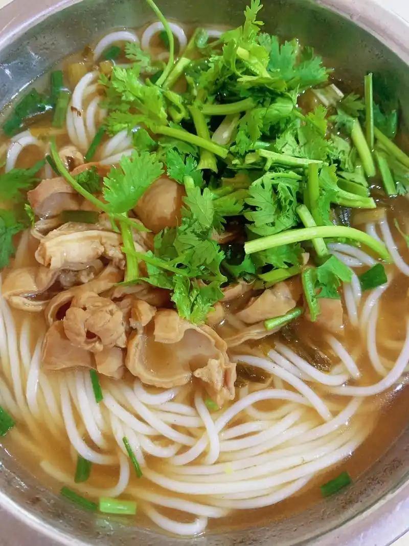 老板将焯过水的软糯的粗粉干放进滚烫着的开水里,接着拿来大瓷碗,从滚烫着的肉汤锅里舀起定量的汤倒在碗里,再从架子上拎过来一条猪大肠,用肉刀在砧板上“咣咣”几下,大肠就寸寸断开,成为一个个如指环般的小块了。他用刀身将大肠盛进碗里,放入煮好的粉干,再加入调料。