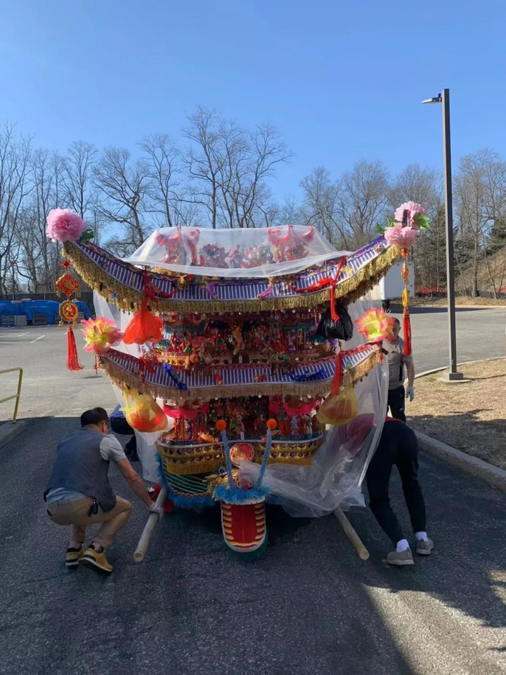 次日一早,纽约乐清同乡会和北美亚裔共创会约20人闻讯赶来帮忙安装、调试,同时与林顺奎保持视频连线,远程指导安装首饰龙最上层的亭台。