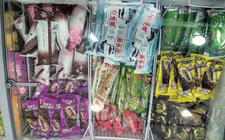不过,今年情况有了不小的变化。6月5日,在鹿城区五马街道的一家零售商超,冰柜里摆放着佑康家装功夫绿豆22.5元/盒(7支装)、东北大板老年糕25元/盒(8支装)、明治巴旦木巧克力雪糕43.8元/盒(6支装)……其中,佑康、东北大板等品牌的产品,占据了冰柜一半的空间。