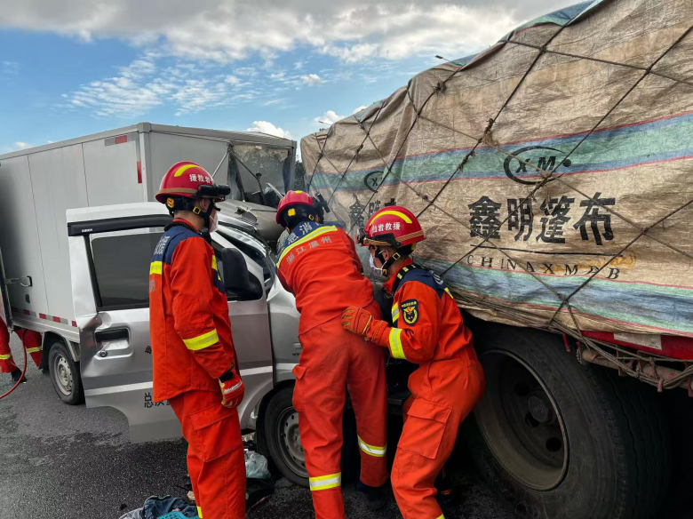 考虑到情况危急,要尽快打通营救的生命通道。由于主驾驶位置已经严重变形,从主驾驶位救援难度巨大且极大可能会对被困人员造成二次伤害,救援人员另辟蹊径,利用主驾驶位后方已损坏的货箱展开营救。